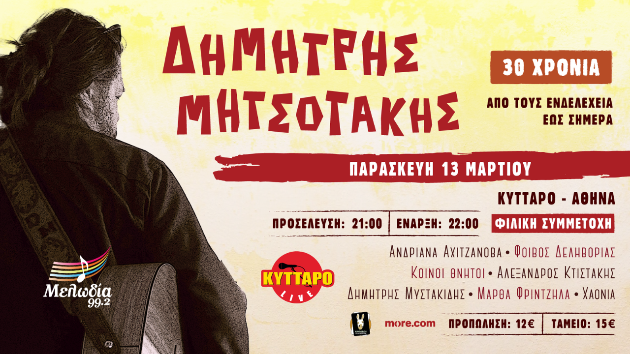 Ο Δημήτρης Μητσοτάκης επιστρέφει στο ΚΥΤΤΑΡΟ , την Παρασκευή 13 Μαρτίου 2026, σε μια συναυλία-γιορτή για όλα όσα καταφέραμε να κρατήσουμε ζωντανά, για όσα γράφτηκαν για να ακουστούν δυνατά, κι άλλοτε πάλι σαν ψίθυρος και σαν εξομολόγηση.
