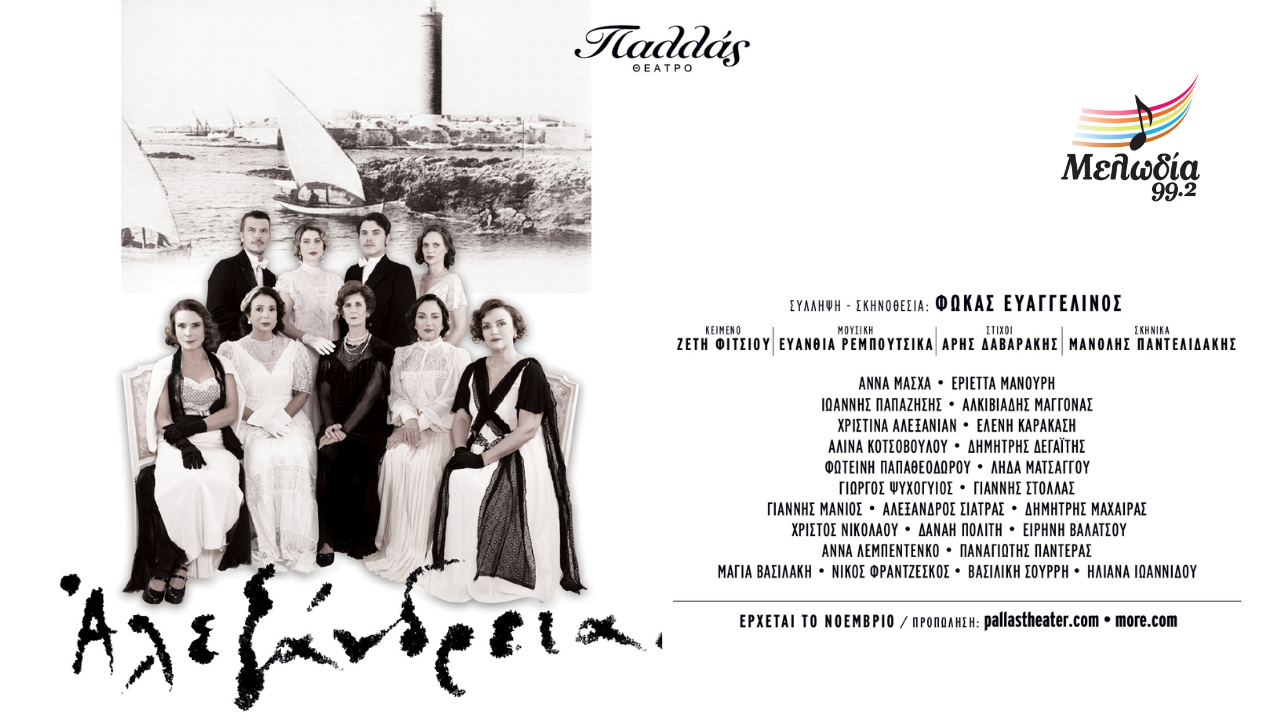 Το Θέατρο Παλλάς παρουσιάζει για τη θεατρική σεζόν 2025-2026, την παράσταση «Αλεξάνδρεια», σε σύλληψη ιδέας και σκηνοθεσία Φωκά Ευαγγελινού. Το πρωτότυπο κείμενο της Ζέτης Φίτσιου θα μας ταξιδέψει στην αιώνια αυτή πόλη αναβιώνοντας τη μαγεία της εποχής, μέσα από μια ερωτική ιστορία. Μία θεατρική παραγωγή υψηλών προδιαγραφών που φιλοδοξεί να προσφέρει στο κοινό μια πολυδιάστατη θεατρική εμπειρία που ενώνει την ποίηση, την μουσική και τη θεατρική αφήγηση.