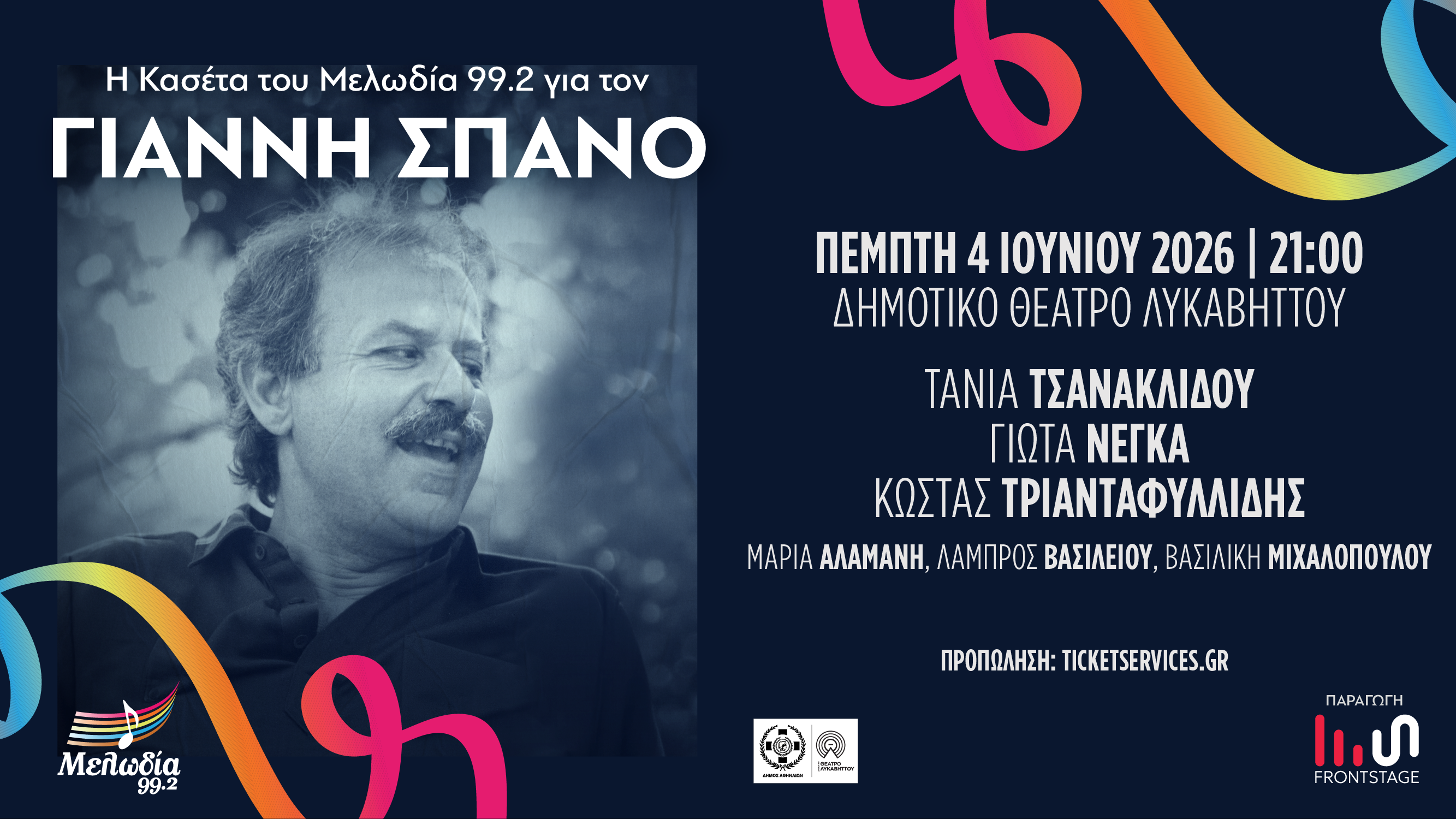 Ο ΜΕΛΩΔΙΑ 99.2 επιστρέφει στον λόφο του Λυκαβηττού την Πέμπτη 4 Ιουνίου, για ένα ξεχωριστό αφιέρωμα στον συνθέτη Γιάννη Σπανό, μαζί με την Τάνια Τσανακλίδου, τη Γιώτα Νέγκα, τον Κώστα Τριανταφυλλίδη και τις τρεις νέες φωνές Μαρία Αλαμανή, Λάμπρο Βασιλείου και Βασιλική Μιχαλοπούλου.